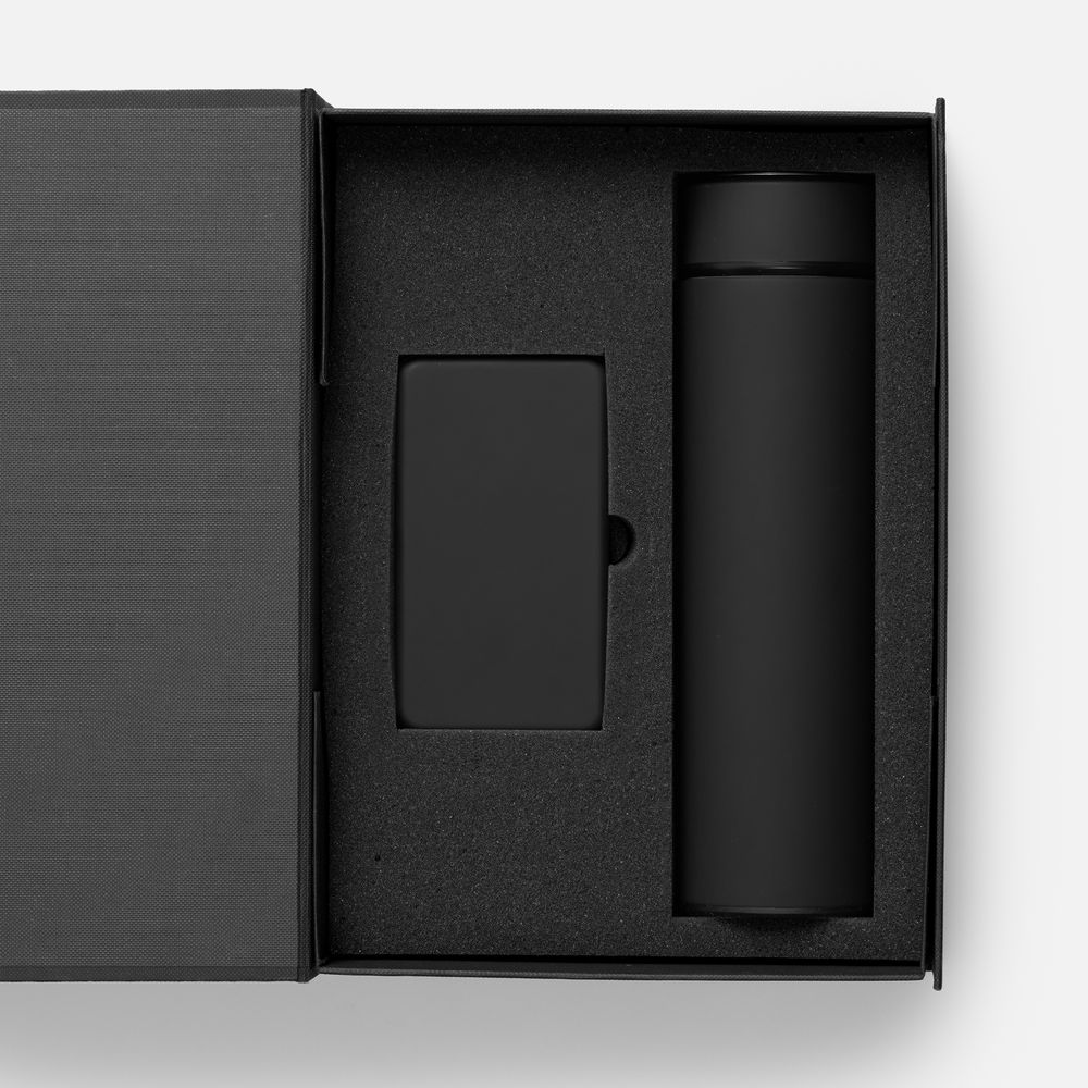 аккумулятор - пластик; покрытие софт-тач; термос - нержавеющая сталь, 304; покрытие софт-тач; коробка - переплетный картон